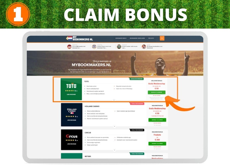 Via Mybookmakers.nl claim je jouw bonus. De link hiervoor vind je boven- en onderaan dit artikel. De TOTO welkomstbonus bedraagt maximaal € 50 en ontvang je na registratie.