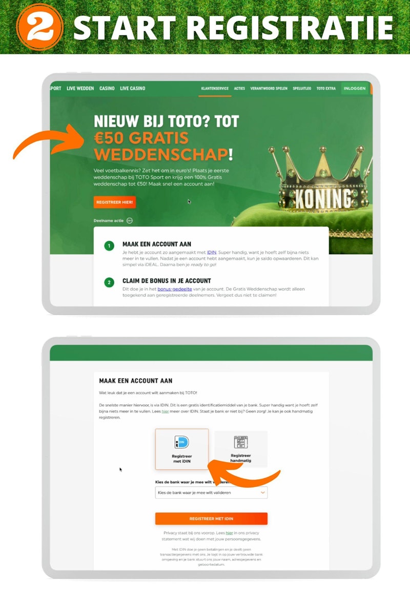 Je komt nu uit op de website van TOTO. Klik hier op de oranje knop met de tekst ‘Registreer hier!’. Nu krijg je de keuze uit twee verschillende mogelijkheden: