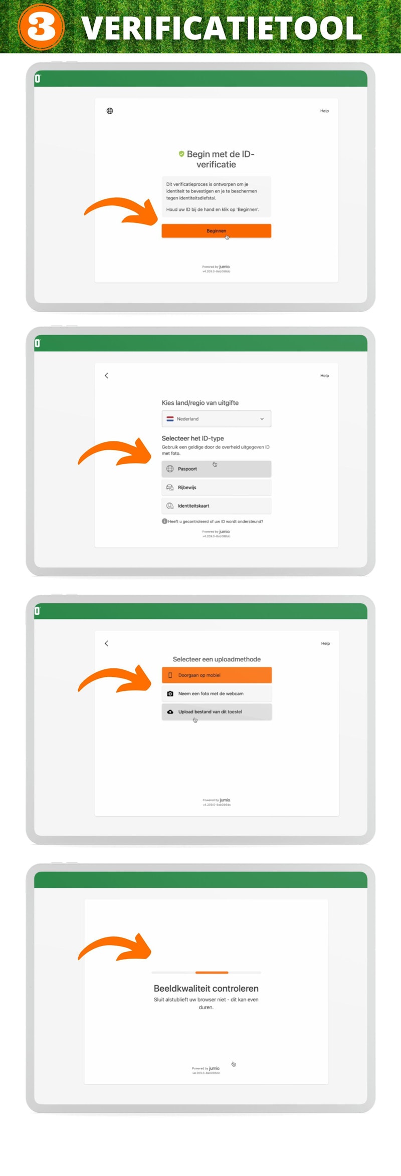 - Upload je identiteitsbewijs door voor één van deze upload methodes te kiezen. Vervolgens wordt de beeldkwaliteit van je identiteitsbewijs gecontroleerd, is deze in orde? Dan is deze stap ten einde. Let op! Dit kan een paar minuten duren, sluit je browser niet terwijl deze stap bezig is.