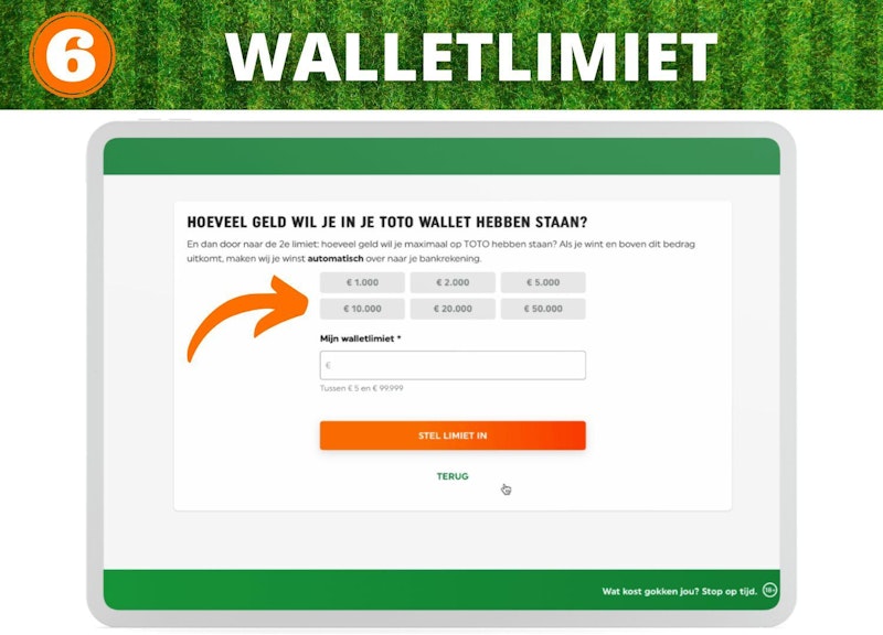 Allereerst stel je de opwaardeerlimiet in. Deze limiet bepaalt hoeveel geld je maximaal in je TOTO wallet kunt storten. Je kunt een limiet per dag, week of maand instellen. De opwaardeerlimiet wordt elke dag om 03.00 uur gereset. Voor de week limiet wordt dit in de nacht van zondag op maandag gedaan en voor de maandlimiet de eerste dag van de maand om 03.00.