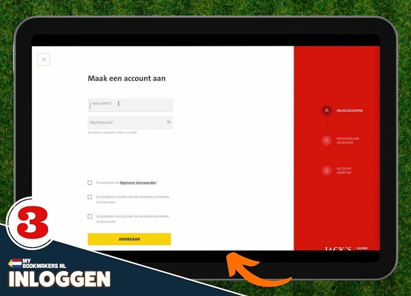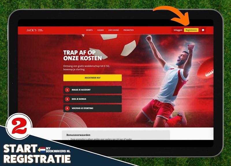 Op de website van Jack´s klik je rechtbovenaan op de gele knop ´registreren´ om het registratieproces te starten.
