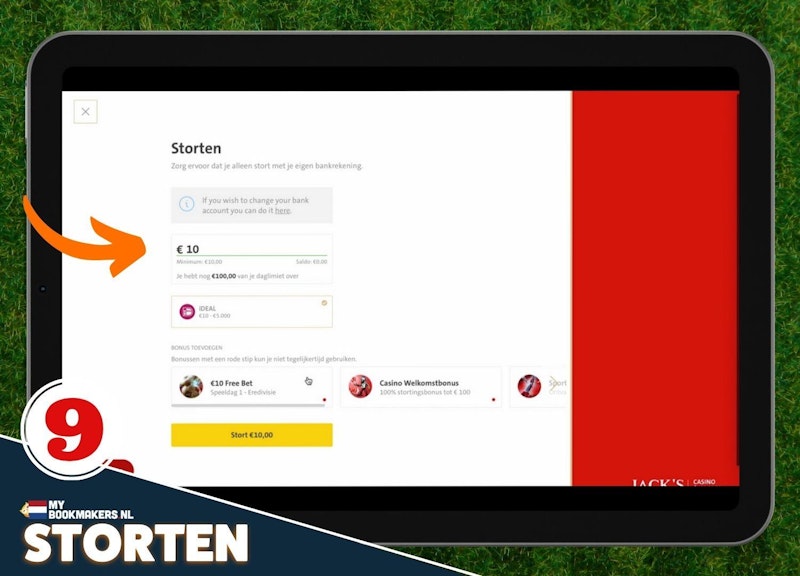 Nu is het tijd voor je eerste storting. Vul hier het bedrag in dat je wilt storten en klik bij ´bonus toevoegen´ op je welkomstbonus naar keuze.
